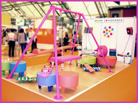 Dunphy's brightly colored naugahyde see saws and swings, ottomans with fun-fur undersides, and padded skateboards- all designed for adults- were the talk of the fair this year. Even the most conservative interior designers and architects couldn't help but smile broadly as they approached the Modern Convenience booth. ICFF attendees of all shapes and sizes took turns on the swing, see saw and the "barefoot" skateboards!