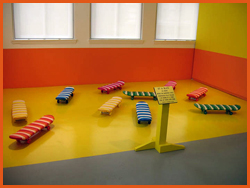 "Didi Dunphy’s work takes a playful tone. Her vividly colored upholstered creations transport the viewer to the realm of the playground. Her oversized see-saw constructed from raspberry metal flake Naugahyde and complete with pink-fringed handle bars invites viewers to climb aboard and rekindle childhood memories. While borrowing the simple lines and bold colors from earlier art movements, Dunphy’s work offers a counterpoint to the austerity and purity of minimalism and hard-edge painting." -- George Kinghorn, Chief Curator