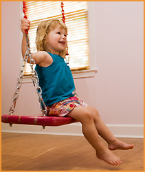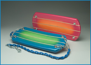 Planed wood with hand airbrushed design, 24" x 10" x 2", stainless steel hanging hardware and plastisol coated playground chain.