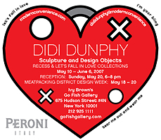 During Design Week 2007, the New York Meatpacking District features Ms. Dunphy's work at Ivy Jean Brown’s Go Fish Gallery, 675 Hudson St. #4N. Didi's new Chain of Love and other modern furnishings are on view May 10th - June 6th, 2007 in the Sculpture and Design Objects Show, and a Peroni-sponsored reception takes place on Sunday, May 20th 6:00 8:00PM.