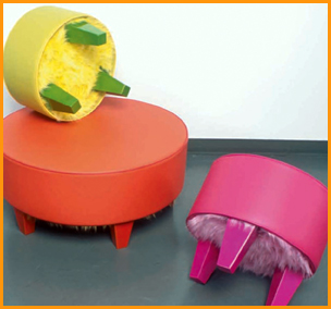 Rearrange, sit, eat, dance on any of Lucy's Rounds.Upholstered vinyl circular units at 24" d. and 17" off your shag carpet! The funky feet are bent hot rolled steel, powder coated in glitter colors. Tickle your toes on the "Fab Fur" underside. Five fun colors plus black and white.