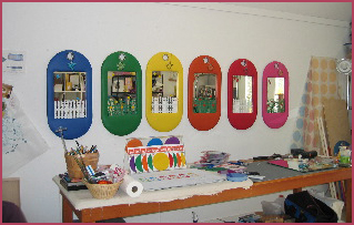 Peer through the woodlands or look over the fence while gazing in the Charm Mirror. Shaped like oversized upholstered ID tags, each mirror has it's own bling and graphics from my neighborhood fences. They come in kid friendly colors: true red, sky blue, orange, pink, sunny yellow and grass green. Frame 33" x 16", Interior acrylic mirror 17" x 12".