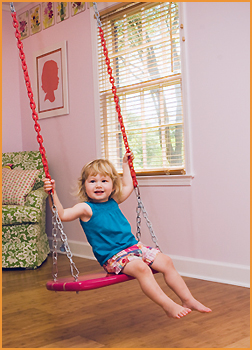 Planed wood with hand airbrushed design, 24" x 10" x 2", stainless steel hanging hardware and plastisol coated playground chain.